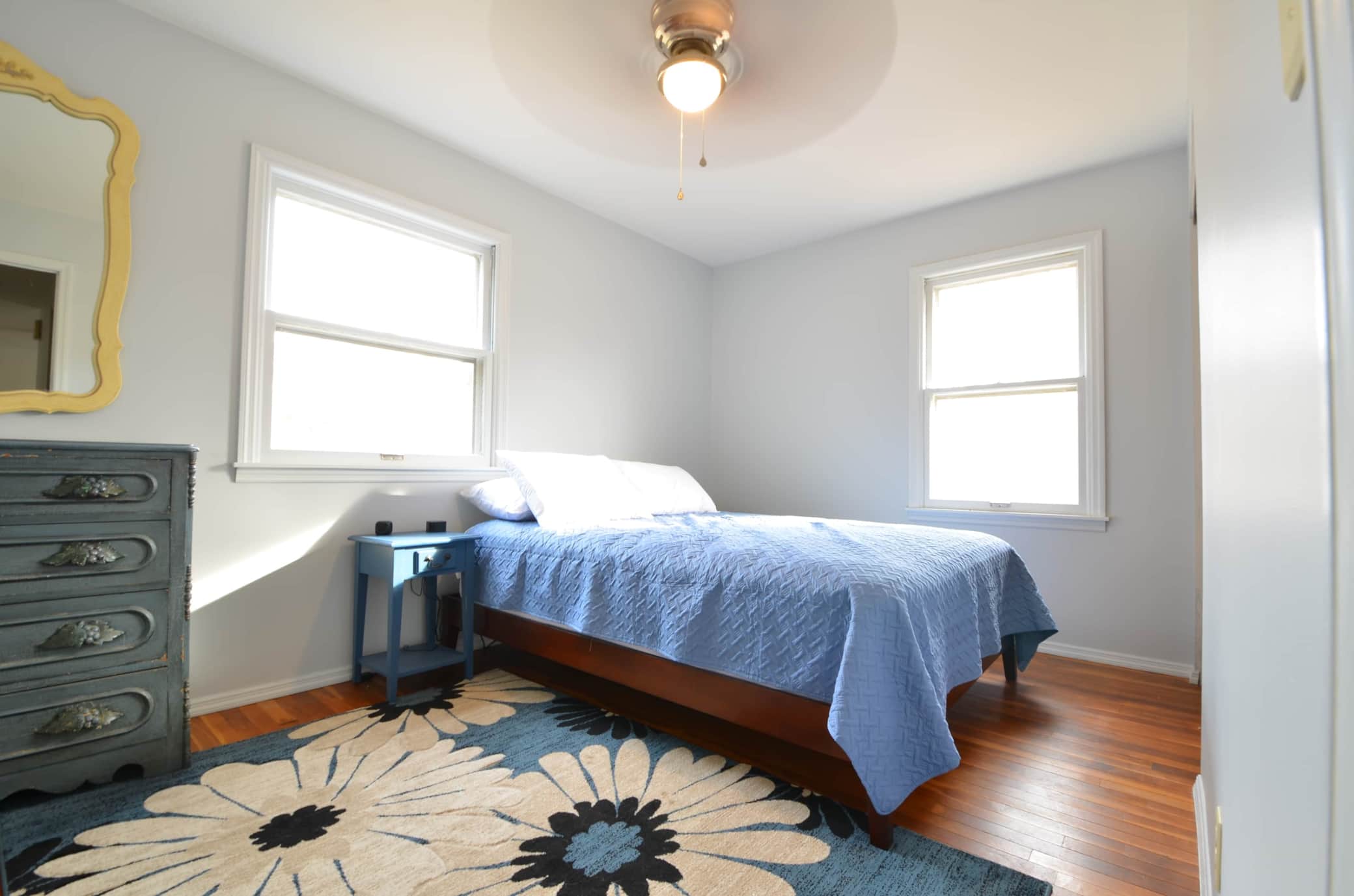 The Blue Room shares the main bathroom with the Red Room. The queen Leesa Hybrid Chill mattress is super comfortable. There is one quilt on the bed and a an additional in the closet.